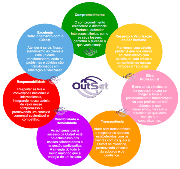 • Valores: A Outset acredita muito na troca de idéias, informações e experiências entre todos os seres humanos e entende que esta integração é o que nos faz crescer a cada dia mais, com uma conduta honesta, integra, coerente, austera e responsável.